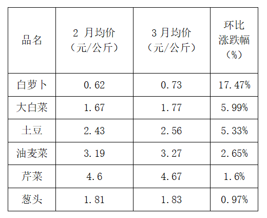 2026 年 3 月蔬菜价格行情分析 整体均价环比回落 交易量显著提升 品种分化凸显 一、整体行情概述 2026 年 3 月,本地蔬菜市场运行呈现 “价格整体下行、交易量大幅增长” 的核心特征。从监测数据来看,3 月蔬菜月均均价达 3.50 元 / 公斤,较 2 月的 3.88 元 / 公斤环比下跌 5%;交易量攀升至 7707 万公斤,较 2 月的 5468 万公斤环比大幅上涨 40.94%。整体来看,市场供应端充足度显著提升,带动流通活跃度增强,居民蔬菜消费成本有所下降。 二、分品种价格涨跌分析 本次监测的 20个蔬菜品类中,价格涨跌分化特征明显,下跌品种数量占比超六成,具体分为上涨、下跌两类进行详细分析: (一)价格上涨品种(6 个) 3 月仅 6 个蔬菜品种价格环比上涨,白萝卜以 17.47% 的涨幅领跑全品类,具体数据如下表: 上涨原因分析:白萝卜、大白菜等秋冬储菜进入尾期,市场流通存量逐步减少,供需关系趋紧推动价格回升;土豆作为耐储刚需品类,终端消费需求稳定,支撑价格小幅上涨;油麦菜、芹菜等叶菜受阶段性供应波动、运输成本小幅上升等因素影响,价格呈现温和上涨态势。 (二)价格下跌品种(14 个) 3 月有 13 个蔬菜品种价格环比下跌,西红柿以 28.35% 的跌幅较大,多数茄果类、瓜类蔬菜价格大幅回落,具体数据如下表: 下跌原因分析:3 月气温逐步回升,本地露地蔬菜、大棚蔬菜集中上市,市场供应端大幅增加,直接带动茄果类(西红柿、茄子、青椒)、瓜类(冬瓜、苦瓜、瓠子)等品类价格大幅回落;小白菜、莴笋等叶菜进入上市旺季,供应量激增叠加需求平稳,价格同步下行;莲藕、花菜等品类受新货上市冲击,价格呈现小幅下跌态势。 三、核心数据亮点 1、交易量创近期新高:3 月万公斤交易量环比上涨 40.94%,反映出市场供应充足、消费需求旺盛,蔬菜流通效率显著提升,市场交易活跃度处于高位。 2、品类涨跌分化显著:白萝卜以 17.47% 的涨幅领涨,西红柿以 28.35% 的跌幅领跌,涨跌品种价差明显,体现出不同蔬菜品类的供需结构差异显著。 3、整体价格回归理性:月均均价环比下跌 5%,契合春季蔬菜集中上市的季节性规律,居民 “菜篮子” 采购成本有所下降,民生消费压力缓解。 四、后市行情展望 短期价格走势:预计 4 月气温进一步升高,本地应季蔬菜上市量将持续增加,市场整体供应量保持充裕,蔬菜均价仍有小幅下行空间,茄果类、瓜类等品类价格或继续回落。 以上数据,仅供参考。 武汉白沙洲农副产品大市场信息中心 2026年4月2日