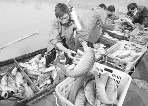 蔡甸区沉湖渔场水质好,鱼儿肥。该渔场开湖一个多月,已售出40多万公斤鲜鱼,其中部分销往深圳、香港等地。图为渔民在捡鱼装箱外运。