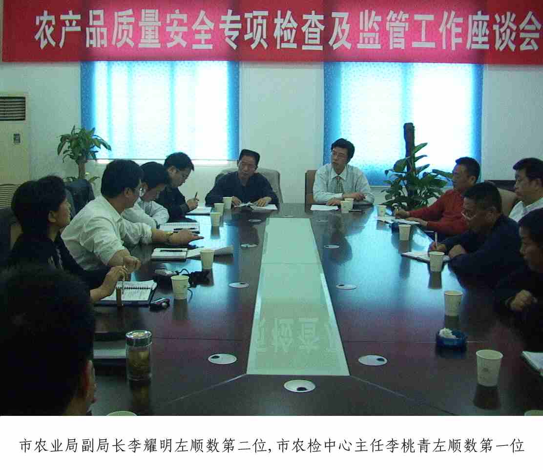 2008年4月24日下午2:30,市、区农业监管部门在武汉白沙洲农副产品大市场举行农产品质量安全监管工作座谈会,市农业局副局长程耀明、法规处处长邱晓东、水产处李明光、市渔政处副处长乔磊、市农检中心主任李桃青、洪山区农检中心主任叶饶佑等市、区农业直属部门领导,市场总经理周国斌、以及公司相关部门领导,市场蔬菜经营户王继春,水产经营户邓克明、陈忠生出席了座谈会。会上市农业局副局长程耀明就当天对市场蔬菜、水产农产品抽检工作做了简要说明;对市场被评为农业产业化国家重点龙头企业表示祝贺;主要针对市场农产品质量安全检测工作进行了探讨,通过三方的意见交流,就政府和公司在市场内共同组建农产品联合检测室的设想达成初步共识。