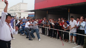 随着一声哨响,比赛正式开始,场上队员紧紧抓牢手中的绳子,齐心协力往后拉,他们咬紧牙关,使尽全力,奋勇拼搏。有的队员憋足了劲,脸胀得通红,两手拉得青筋直冒;有的队员身体倾斜呈30度角,就快躺到地上去;水产管理部的张浩仅管右手中指已经拉破了一大块皮,硬是仍然咬着牙,坚持着,丝毫不松手。每一个参赛队都全力以赴。最精彩的要数总经办队——粮油协会队,几位公司领导亲自上阵,虽然单从眼前参赛队员们的块头就已经能明显看出实力的差距,但总经办队并不示弱,在公司领导的带领下,队员们斗志昂扬,特别是在第二局,硬是僵持了三十七秒,结果虽然不尽人意,却虽败尤荣。