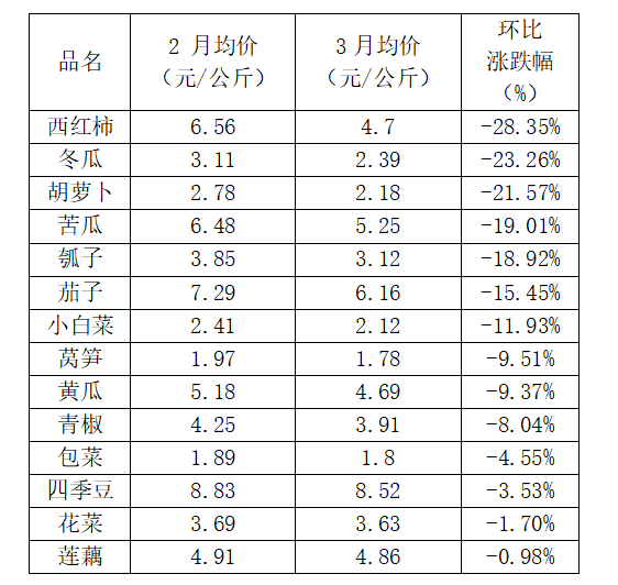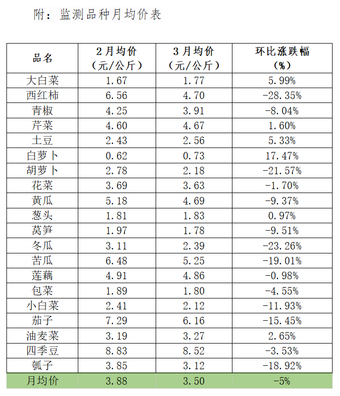 2026 年 3 月蔬菜价格行情分析 整体均价环比回落 交易量显著提升 品种分化凸显 一、整体行情概述 2026 年 3 月,本地蔬菜市场运行呈现 “价格整体下行、交易量大幅增长” 的核心特征。从监测数据来看,3 月蔬菜月均均价达 3.50 元 / 公斤,较 2 月的 3.88 元 / 公斤环比下跌 5%;交易量攀升至 7707 万公斤,较 2 月的 5468 万公斤环比大幅上涨 40.94%。整体来看,市场供应端充足度显著提升,带动流通活跃度增强,居民蔬菜消费成本有所下降。 二、分品种价格涨跌分析 本次监测的 20个蔬菜品类中,价格涨跌分化特征明显,下跌品种数量占比超六成,具体分为上涨、下跌两类进行详细分析: (一)价格上涨品种(6 个) 3 月仅 6 个蔬菜品种价格环比上涨,白萝卜以 17.47% 的涨幅领跑全品类,具体数据如下表: 上涨原因分析:白萝卜、大白菜等秋冬储菜进入尾期,市场流通存量逐步减少,供需关系趋紧推动价格回升;土豆作为耐储刚需品类,终端消费需求稳定,支撑价格小幅上涨;油麦菜、芹菜等叶菜受阶段性供应波动、运输成本小幅上升等因素影响,价格呈现温和上涨态势。 (二)价格下跌品种(14 个) 3 月有 13 个蔬菜品种价格环比下跌,西红柿以 28.35% 的跌幅较大,多数茄果类、瓜类蔬菜价格大幅回落,具体数据如下表: 下跌原因分析:3 月气温逐步回升,本地露地蔬菜、大棚蔬菜集中上市,市场供应端大幅增加,直接带动茄果类(西红柿、茄子、青椒)、瓜类(冬瓜、苦瓜、瓠子)等品类价格大幅回落;小白菜、莴笋等叶菜进入上市旺季,供应量激增叠加需求平稳,价格同步下行;莲藕、花菜等品类受新货上市冲击,价格呈现小幅下跌态势。 三、核心数据亮点 1、交易量创近期新高:3 月万公斤交易量环比上涨 40.94%,反映出市场供应充足、消费需求旺盛,蔬菜流通效率显著提升,市场交易活跃度处于高位。 2、品类涨跌分化显著:白萝卜以 17.47% 的涨幅领涨,西红柿以 28.35% 的跌幅领跌,涨跌品种价差明显,体现出不同蔬菜品类的供需结构差异显著。 3、整体价格回归理性:月均均价环比下跌 5%,契合春季蔬菜集中上市的季节性规律,居民 “菜篮子” 采购成本有所下降,民生消费压力缓解。 四、后市行情展望 短期价格走势:预计 4 月气温进一步升高,本地应季蔬菜上市量将持续增加,市场整体供应量保持充裕,蔬菜均价仍有小幅下行空间,茄果类、瓜类等品类价格或继续回落。 以上数据,仅供参考。 武汉白沙洲农副产品大市场信息中心 2026年4月2日